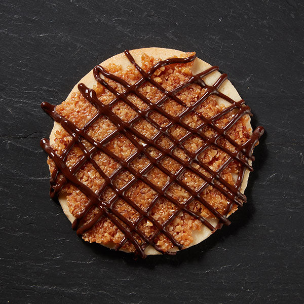 A shortbread cookie, infused with coconut oil is covered in a layer of toasted coconut, caramel and drizzled with dark chocolate.
